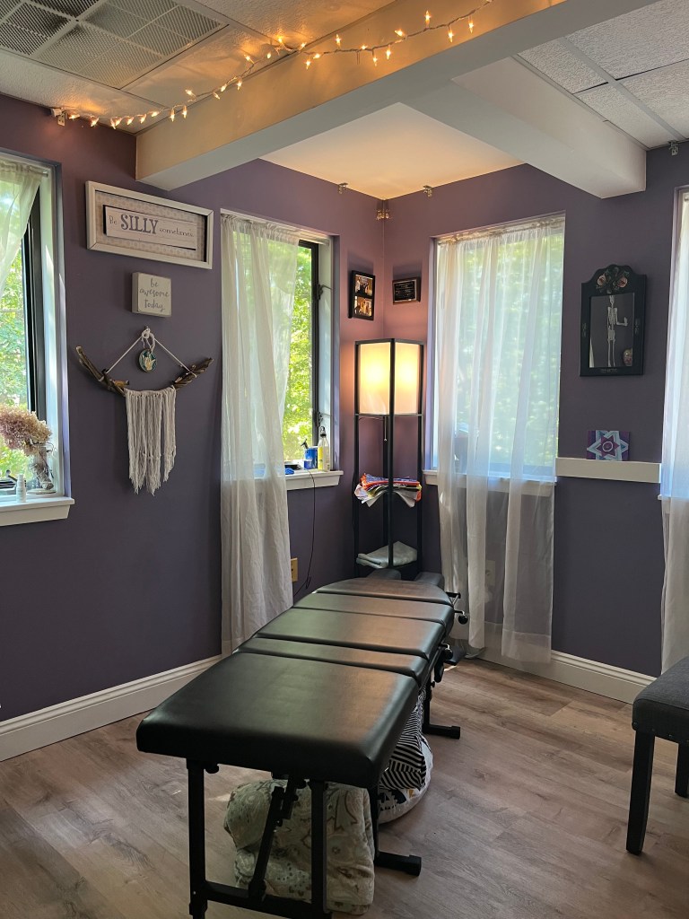 Typically an adjustment starts with the practice member face down on the table. It can be adapted to be done in a seated position or in the case of a child on a pillow, with a parent or “on the go” in our toy area. There are also pregnancy pillows for our expecting practice members! Dr. Ali will quickly check for tension patterns and reflexes from head to toe. This determines where to look to adjust.